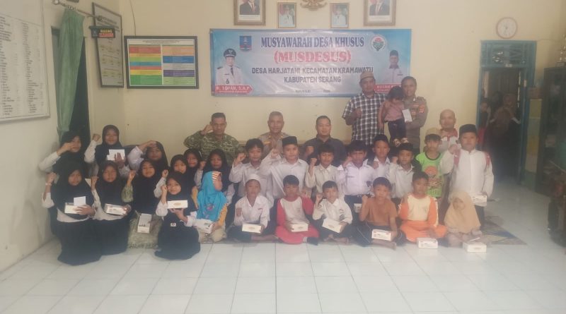 POLRESTA SERKOT_ Anggota Polsek Kramatwatu Polrestaserkot melaksanakan kegiatan pemberian santunan anak yatim sebanyak 35 orang di desa Harjatani kec.kramatwatu Daerah Hukum Polresta Serkot Polda Banten pada,jumat (17/4/2026).