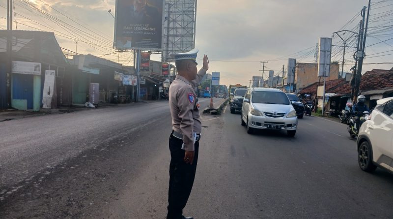 POLRESTA SERKOT_ AKP agus sutiana kanit lalu lintas Polsek Kramatwatu Polresta Serkot Polda Banten melaksanakan pengaturan di jl.serang- cilegon di perempatan serdang Kec.Kramatwatu,jumat (24/4/2026).